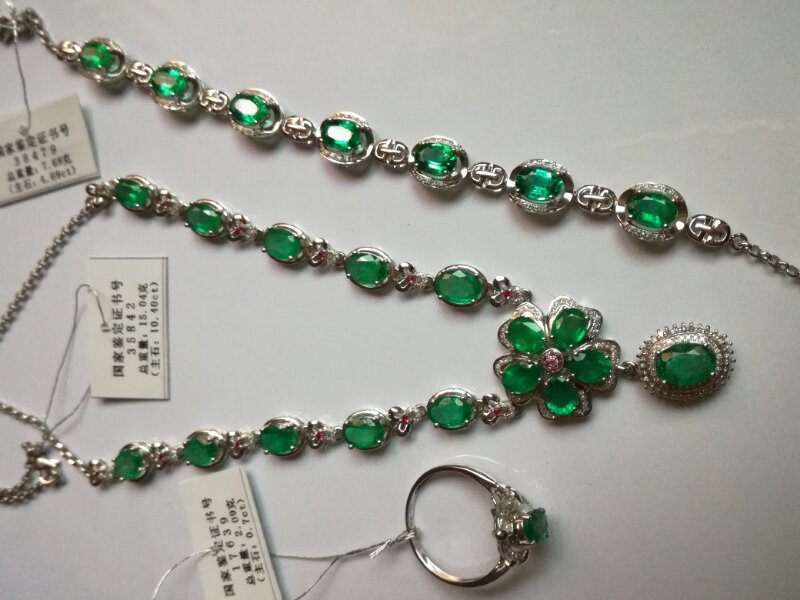 特透、色艳、石大且石总重量超群的18k珍稀祖母绿套饰